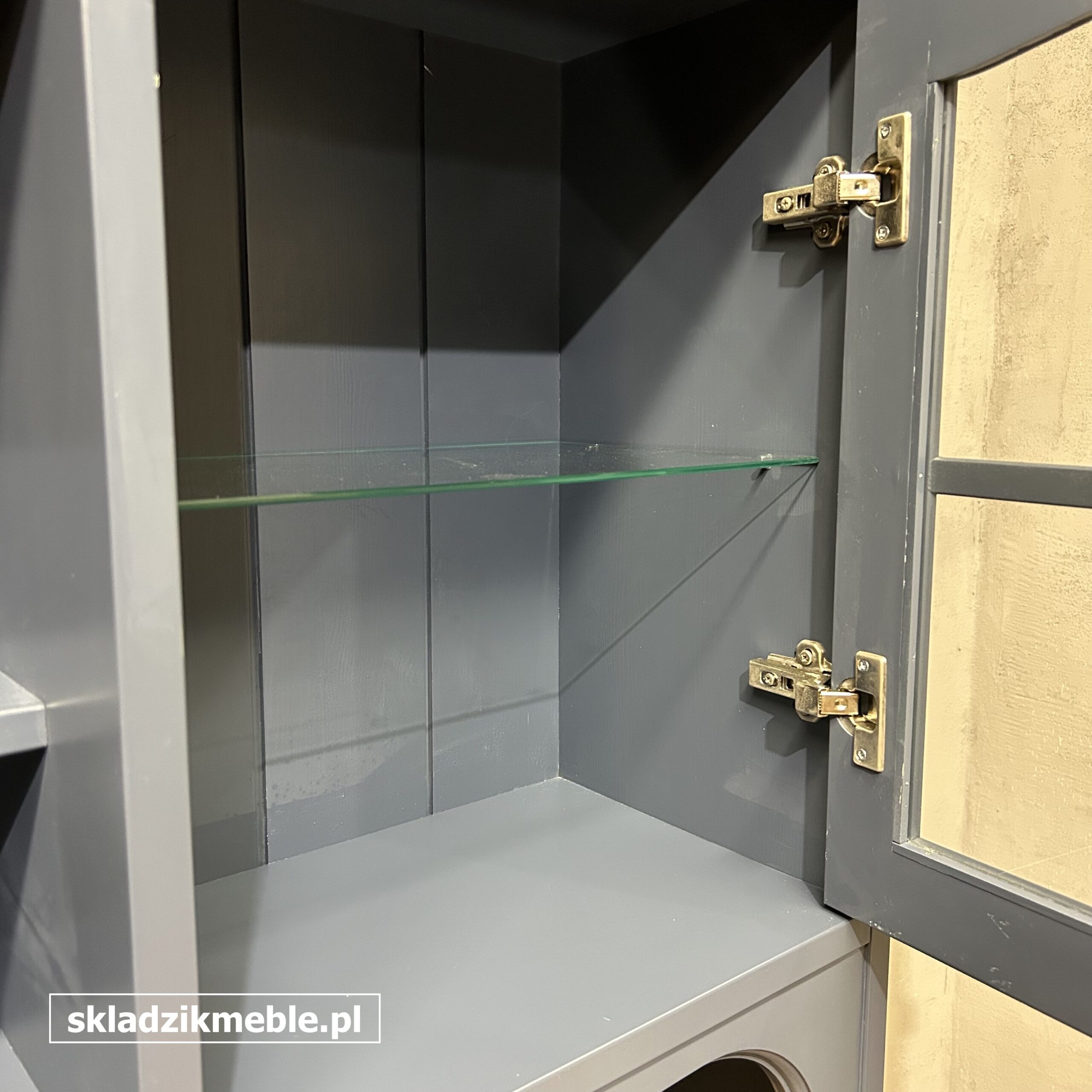 Dwie przeszklone witryny nad blatem ze szklanymi półkami wewnątrz