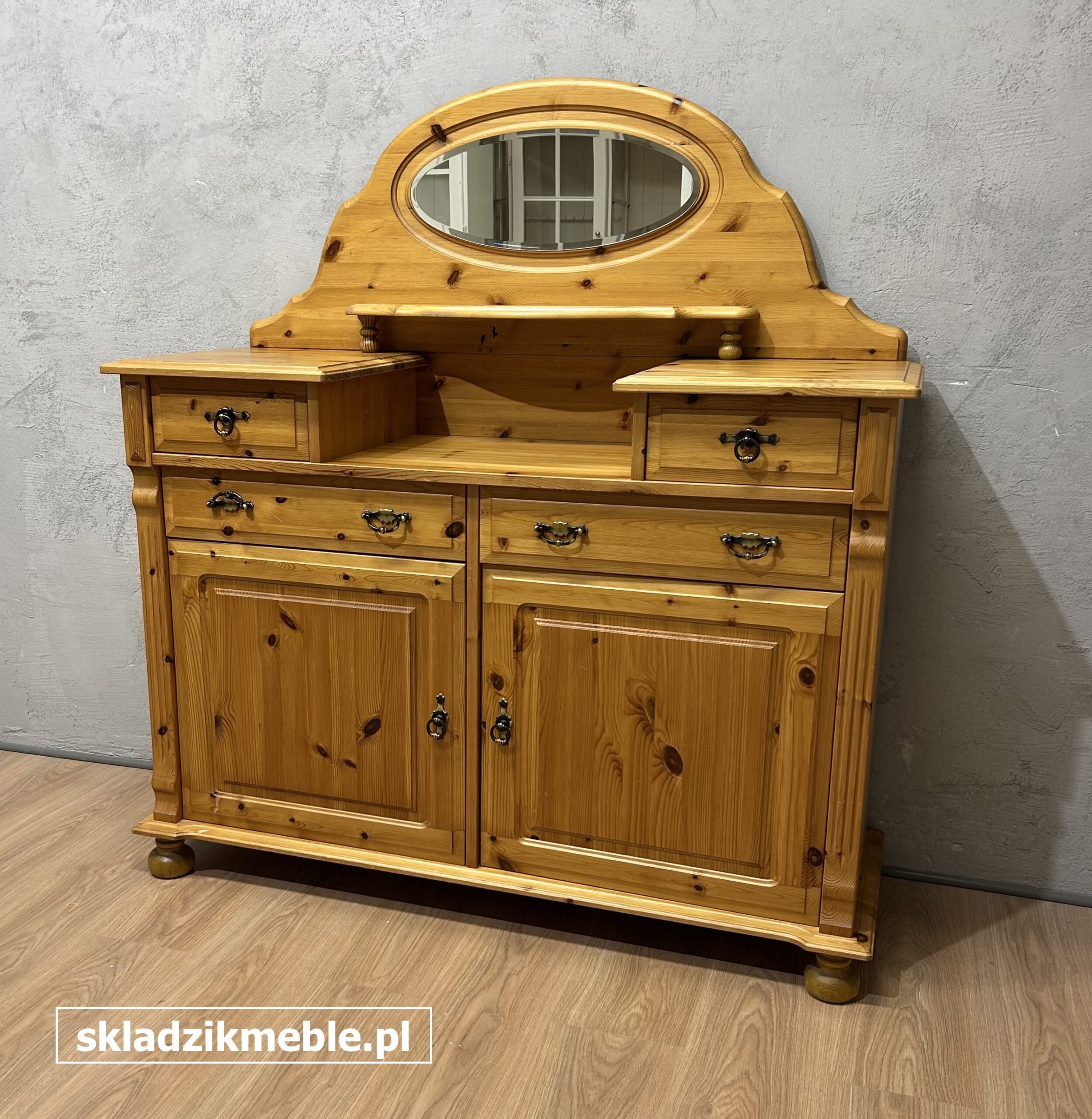 Komoda sosnowa z frezowanym, owalnym lustrem